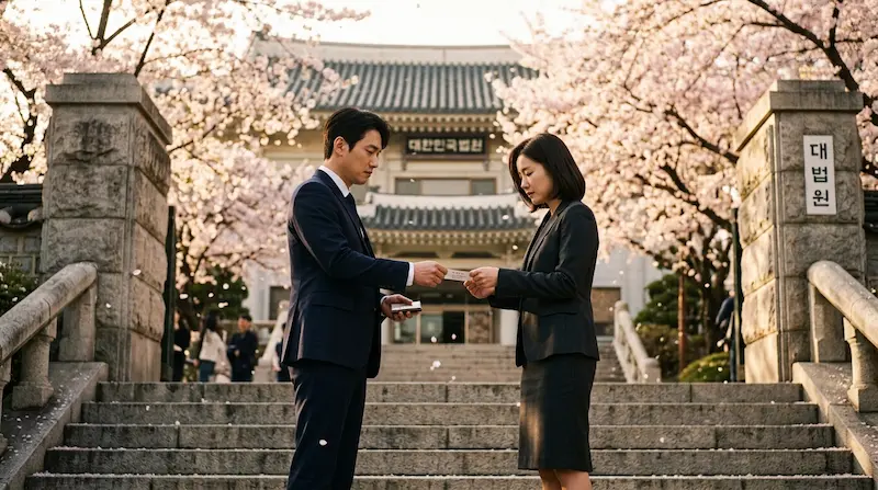 He has utility bills piling up and no income. Bong-soo suggests he market himself at courthouses instead of waiting in the empty office. Yi-rang tries, but it goes poorly — a frustrated woman chews him out outside the courtroom.