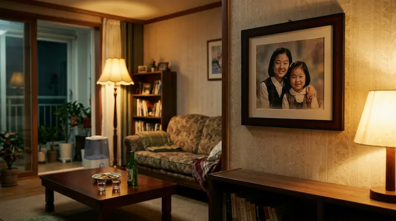 Na-hyun gets drunk. Yi-rang calls a chauffeur but cannot leave her alone, so he accompanies her home. Inside, he sees the photos — Na-hyun with her sister, Na-hyun protesting as a child. In her drunken state, Na-hyun whispers: “I wish you could see my sister.”